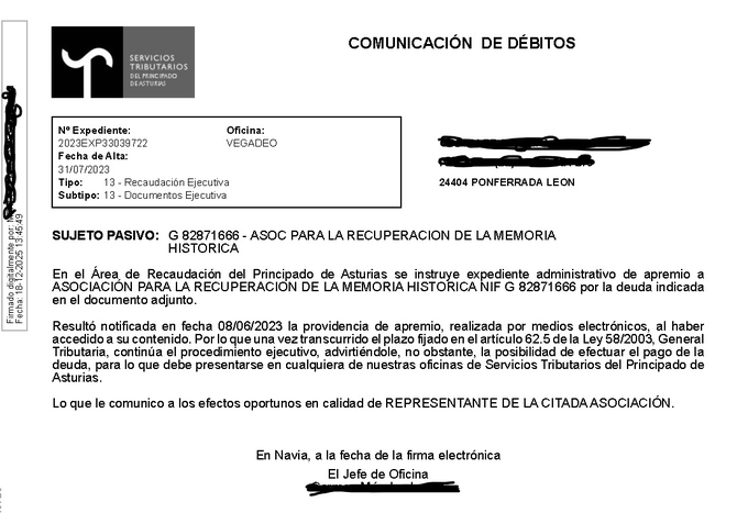 El Principado de Asturias nos felicita la Navidad notificando una tasa (“impuesto sobre construcciones”), por buscar a dos desaparecidos de represión franquista en una fosa en Navia en 2022.