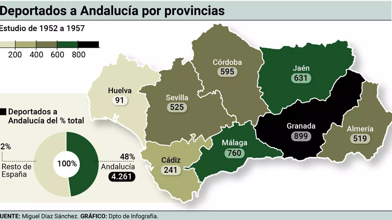 El historiador Miguel Díaz Sánchez, autor de Fronteras de papel (PUV, 2024), calcula que entre 1939 y 1957 se devolvieron desde Barcelona a 70.000 emigrantes, a los que habría que añadir los de Madrid. De los 8.811 registros nominales que ha logrado consultar entre 1952 y 1957, casi la mitad correspondían a andaluces, lo que da una idea de cómo el sur concentró buena parte de la emigración reprimida durante el franquismo en estas décadas posteriores a la Guerra Civil. La expedición de los llamados billetes de la miseria, con los que se pagaba la devolución, ha permitido a este historiador dar cuenta de la magnitud de una operación que se mantuvo durante dos décadas.