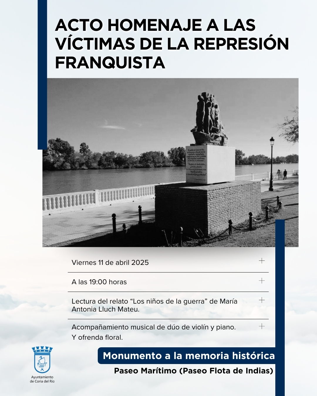 El próximo viernes 11 de abril, a las 19:00 h, el Ayuntamiento de Coria del Río organiza un acto en recuerdo y homenaje a quienes sufrieron la represión franquista, en el Monumento a la Memoria Histórica del Paseo Marítimo (Paseo Flota de Indias).