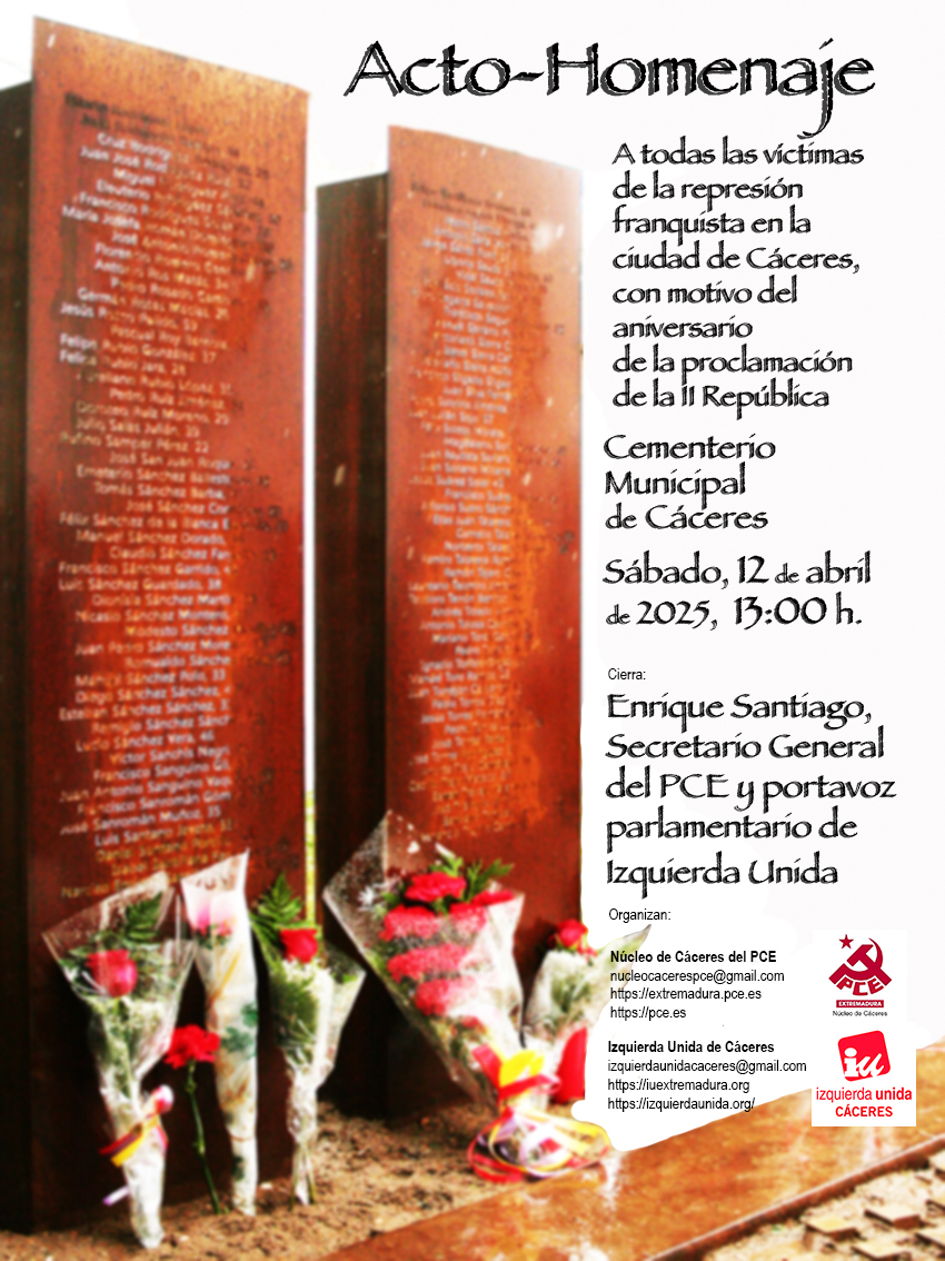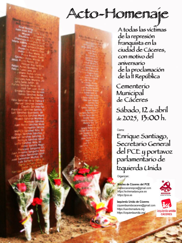 Acto-Homenaje a todas las víctimas de la represión franquista en la ciudad de Cáceres Cuándo 12 de abril de 2025 13:00 - 14:00 Añadir al calendario Descargar ICS Google Calendar iCalendar Office 365 Outlook Live Dónde Cementerio Municipal , Cáceres Compartir: