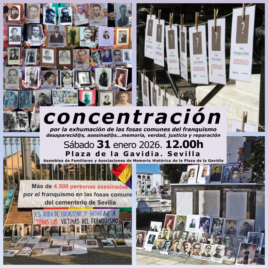 Asamblea memorialista La Gavidia (Sevilla) Cuándo 31 de enero de 2026 12:00 Añadir al calendario Descargar ICS Google Calendar iCalendar Office 365 Outlook Live Dónde Plaza de la Gavidia , Sevilla Compartir: