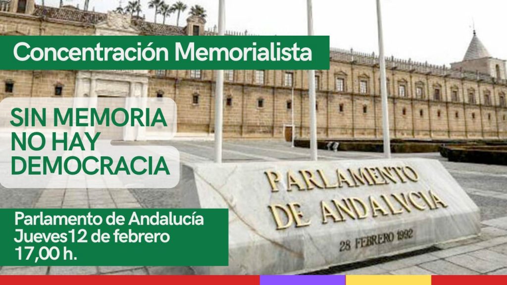 El próximo *jueves 12 de febrero a las 5 de la tarde*, Familiares de víctimas del franquismo, Asociaciones Memorialistas, Organizaciones sociales, sindicales, políticas y ciudadanas estaremos en la puerta del parlamento apoyando la Moción Parlamentaria relativa a Memoria Histórica y Democrática de Andalucía que presentará José Manuel Gómez Jurado, parlamentario del grupo Por Andalucía al pleno del parlamento Andaluz. Seguro que con nuestro esfuerzo conseguiremos que la moción sea una denuncia pública y un grito señalando los incumplimientos de las leyes de Memoria en Andalucía. Te esperamos. Asistirán compañeras y compañeros de otras provincias, parlamentarias y parlamentarios… Difunde en tu grupo y no faltes.