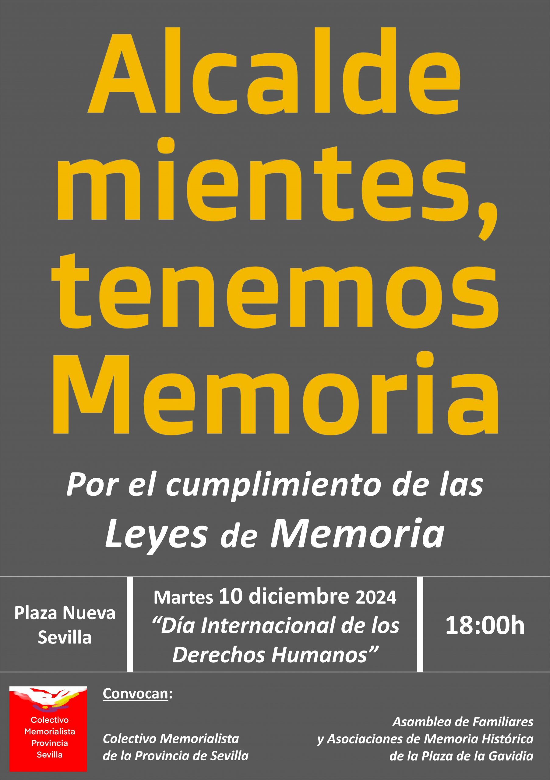 Concentración por el cumplimiento de las Leyes de Memoria. Sevilla Cuándo 10 de diciembre de 2024 18:00 - 20:00 Añadir al calendario Descargar ICS Google Calendar iCalendar Office 365 Outlook Live Dónde Plaza Nueva , Sevilla Manifiesto: 2024.12.10. VERSIÓN FINAL del Manifiesto memorialista 10 de diciembre 2024 Compartir: Adjuntos 2024.12.10. VERSIÓN FINAL del Manifiesto memorialista 10 de diciembre 2024 (375 kB)