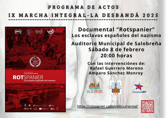 El documental ‘Rotspanier, los esclavos españoles del nazismo’ reanuda sus presentaciones y proyecciones en 2025. En febrero se acumulan. El sábado día 8 se proyecta en paralelo en Salobreña (Granada) y Lleida. Estaremos en Salobreña a las 8 de la tarde en el Auditorio Municipal y en la capital catalana, a las 6 de la tarde, presentado allí por el historiador de la Universidad de Tarragona Jaume Camps en la Sala Screenbox.