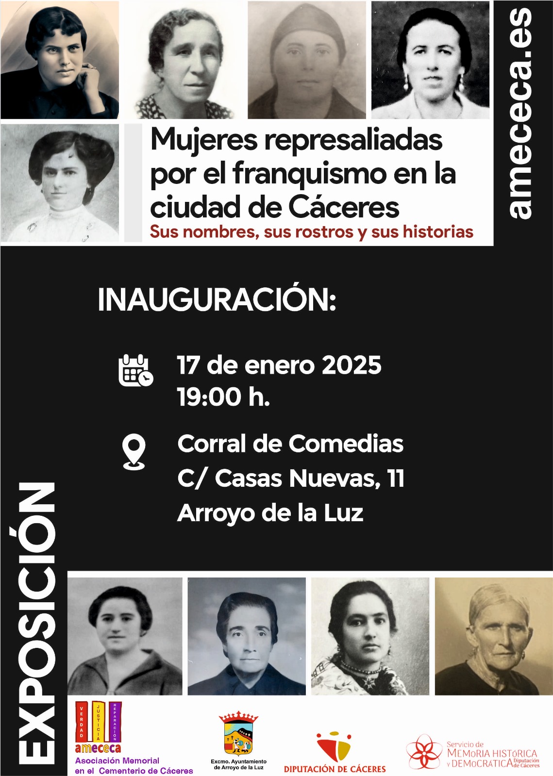 Os informamos que nuestra exposición MUJERES REPRESALIADAS POR EL FRANQUISMO EN LA CIUDAD DE CÁCERES que hemos elaborado desde AMECECA será inaugurada el próximo viernes 17 de enero a las 18:00 h. en el Corral de las Comedias (C/ Casas Nuevas, 11) de ARROYO DE LA LUZ (Cáceres).
