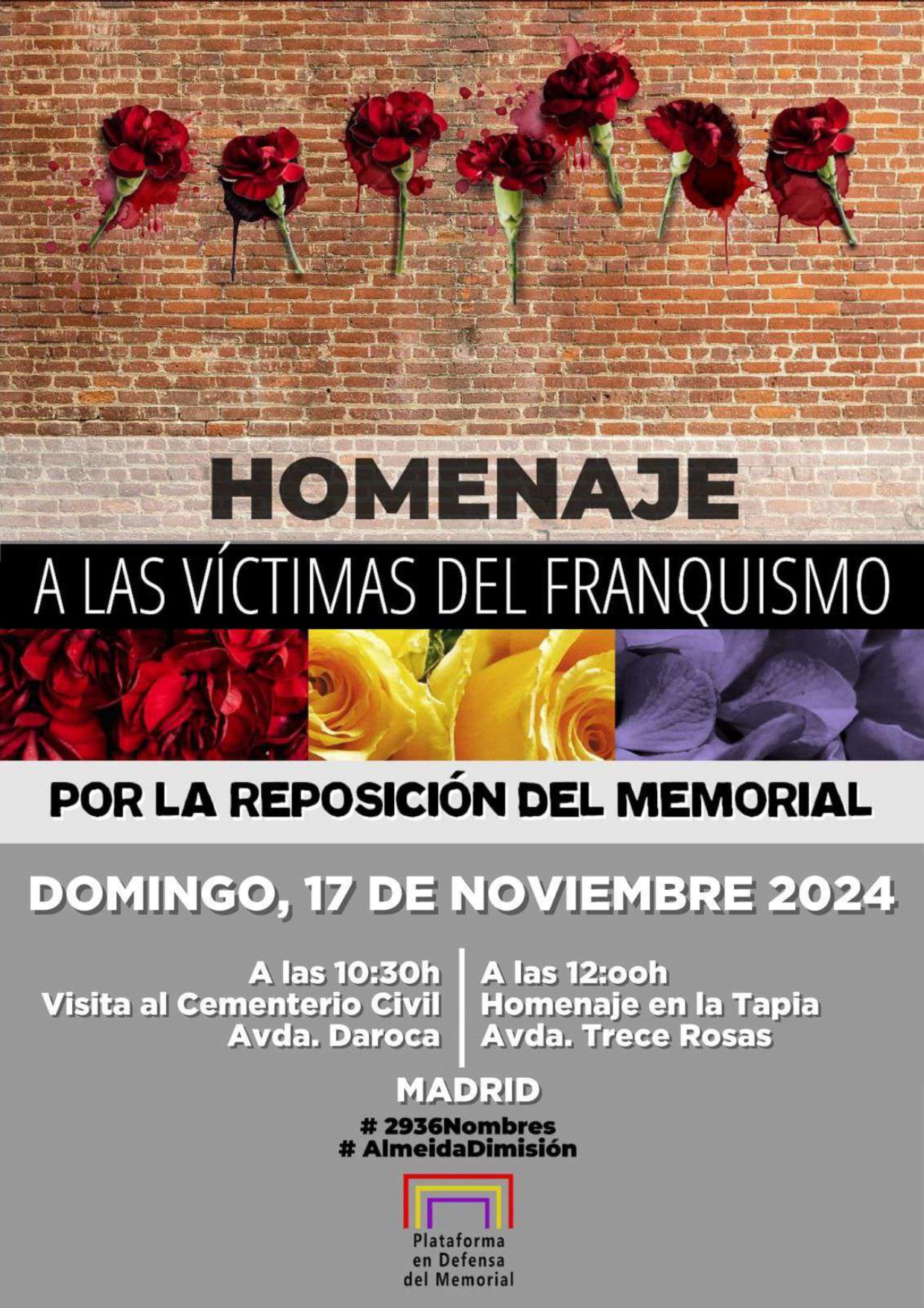 Homenaje a las víctimas del franquismo. Madrid Cuándo 17 de noviembre de 2024 10:30 - 13:30 Añadir al calendario Descargar ICS Google Calendar iCalendar Office 365 Outlook Live Dónde Cementerio Civil , Madrid Compartir: