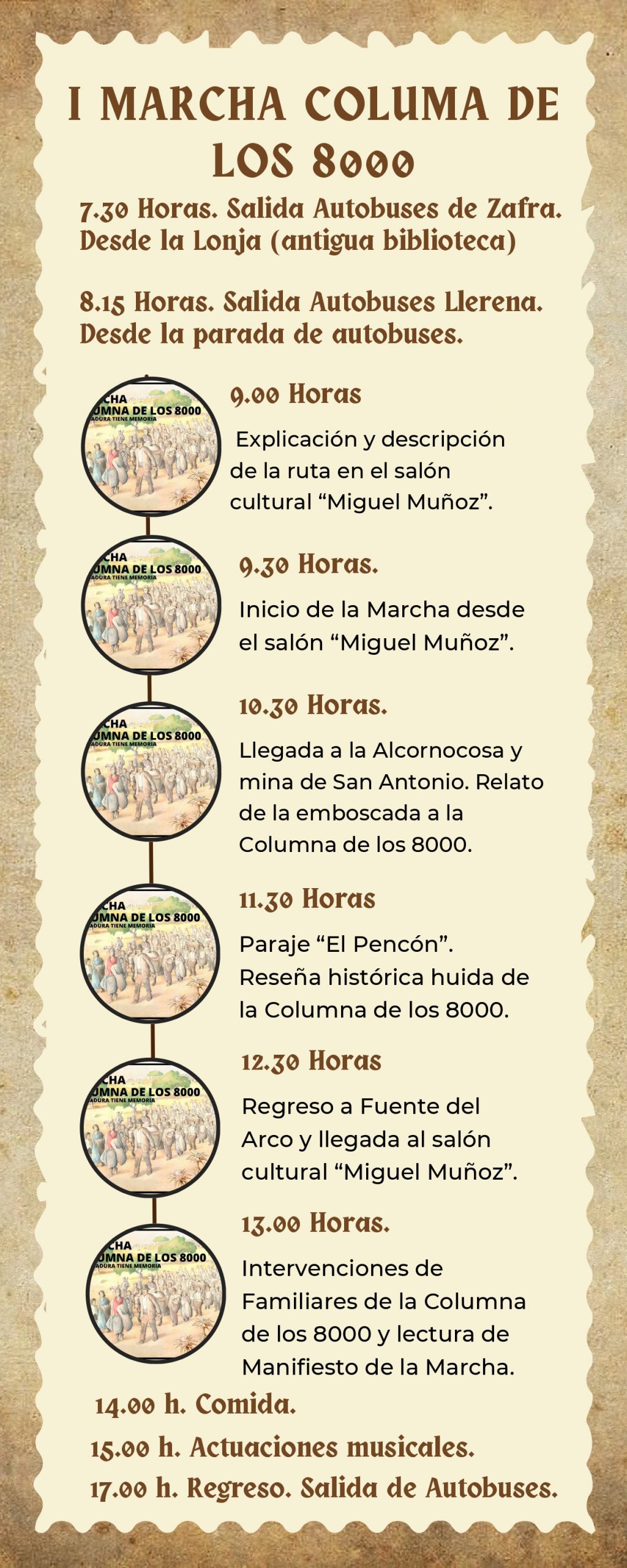 I Marcha Columna de los 8.000: Extremadura tiene Memoria Cuándo 15 de septiembre de 2024 09:00 - 15:00 Añadir al calendario Descargar ICS Google Calendar iCalendar Office 365 Outlook Live Dónde Varios. Ver carteles , I Marcha Columna de los 8.000: Extremadura tiene Memoria. Compartir: Adjuntos 13. Horario de la Marcha (3 MB)