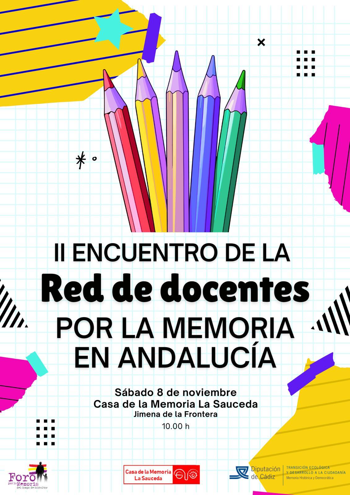 *_Casa de la Memoria, Jimena de la Frontera_*Si eres docente y tienes interés por la memoria histórica, el próximo 8 de noviembre celebramos un nuevo encuentro de la Red de Docentes por la Memoria en Andalucía. Con el apoyo del Foro por la Memoria del Campo de Gibraltar y la Asociación Casa de la Memoria, te convocamos a las 10.00h en la Casa de la Memoria, en Jimena de la Frontera (Cádiz).