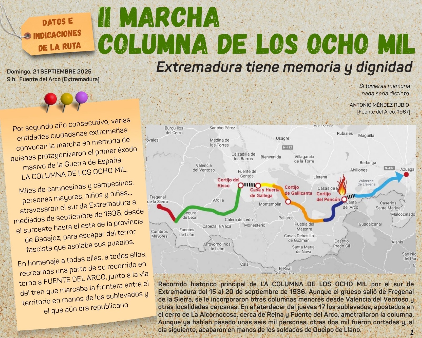 Un año más, por segundo año consecutivo, Extremadura volverá a marchar para recordar, en concreto, el primer éxodo de población civil tras el golpe de estado franquista, en lo que se denominó ‘La Columna de los ocho mil’, y en general, para reivindicar nuestro derecho a tener memoria como pueblo extremeño.