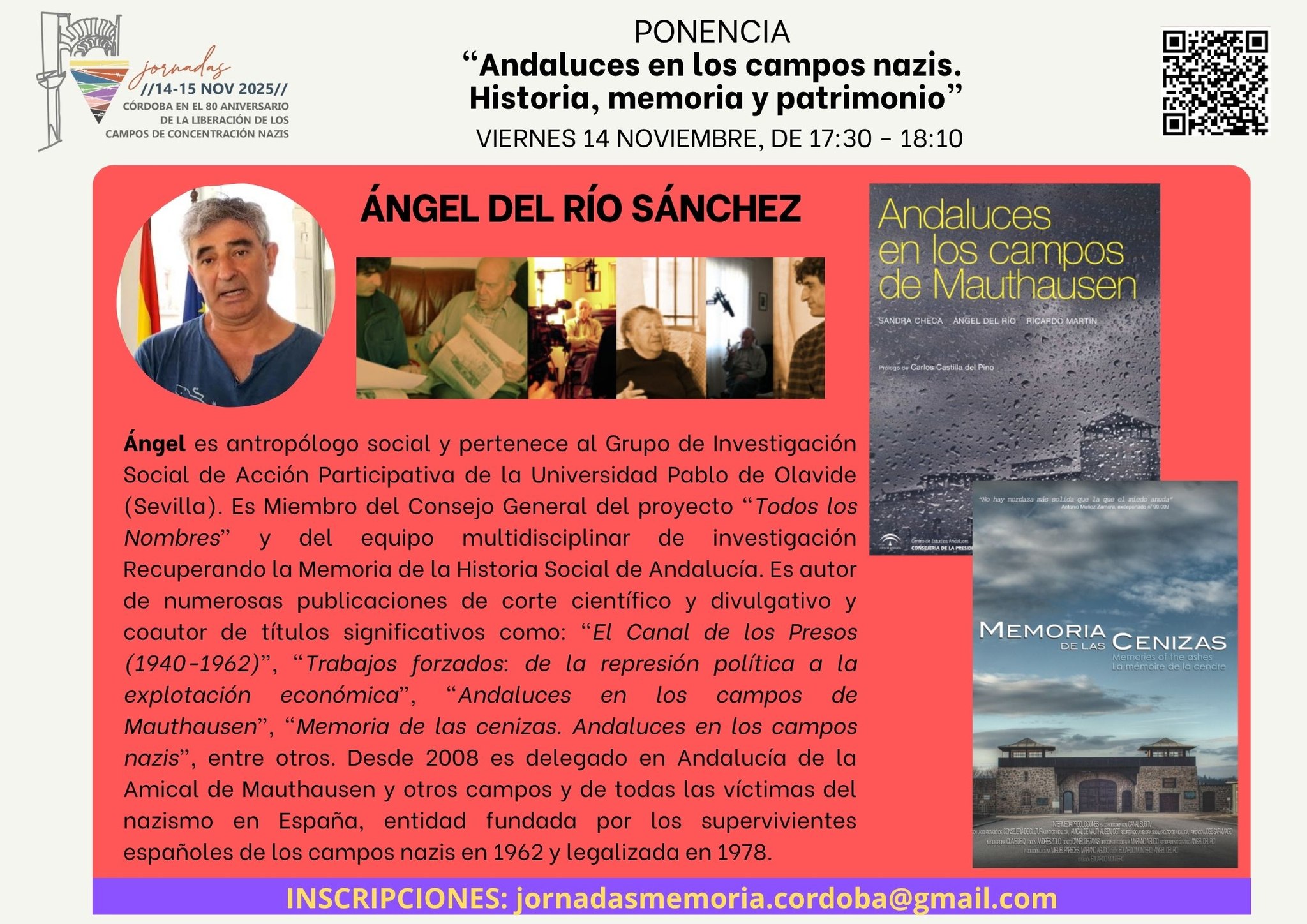 Ponencia: “Andaluces en los campos nazis. Historia, memoria y patrimonio”. Córdoba Cuándo 14 de noviembre de 2025 17:30 - 18:15 Añadir al calendario Descargar ICS Google Calendar iCalendar Office 365 Outlook Live Dónde Rectorado de la Universidad de Córdoba , Córdoba Compartir: