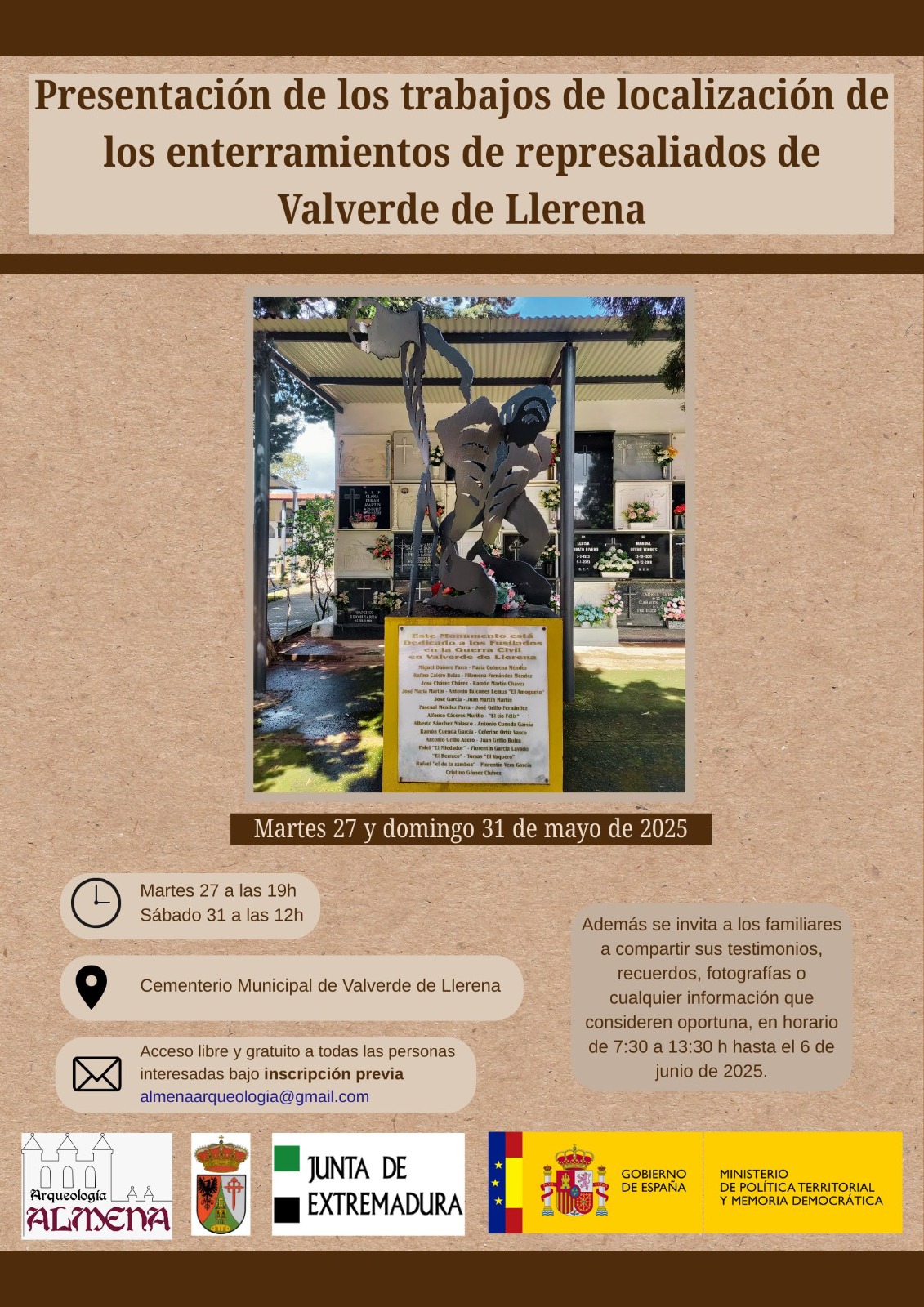 Presentación de los trabajos de localización de los enterramientos de represaliados de Valverde de Llerena (Badajoz) Cuándo 31 de mayo de 2025 12:00 - 14:00 Añadir al calendario Descargar ICS Google Calendar iCalendar Office 365 Outlook Live Dónde Cementerio Municipal , Valverde de Llerena (Badajoz) Compartir: