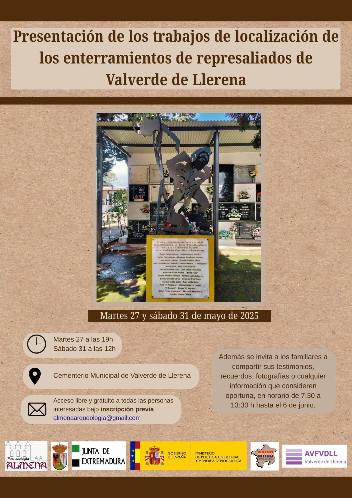 Presentación de los trabajos de localización de los enterramientos de represaliados de Valverde de Llerena (Badajoz) Cuándo 27 de mayo de 2025 19:00 - 21:00 Añadir al calendario Descargar ICS Google Calendar iCalendar Office 365 Outlook Live Dónde Cementerio Municipal , Valverde de Llerena (Badajoz) Compartir: