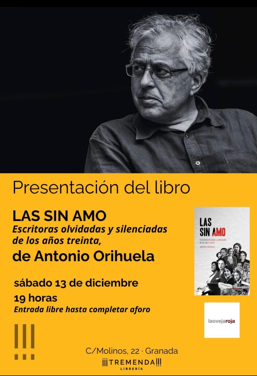 Presentación del libro “Las sin amo. Escritoras olvidadas y silenciadas de los años treinta”. Granada Cuándo 13 de diciembre de 2025 19:00 - 21:00 Añadir al calendario Descargar ICS Google Calendar iCalendar Office 365 Outlook Live Dónde Librería Tremenda C/ Molinos, 22, Granada Compartir: