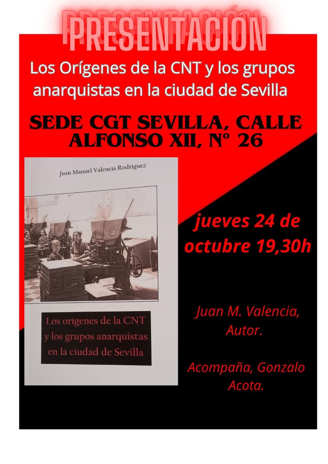 Presentación del libro “Los orígenes de la CNT y los grupos anarquistas en la ciudad de Sevilla” Cuándo 24 de octubre de 2024 19:30 - 21:30 Añadir al calendario Descargar ICS Google Calendar iCalendar Office 365 Outlook Live Dónde Sede CGT Sevilla Calle Alfonso XII, 26, Sevilla Compartir: