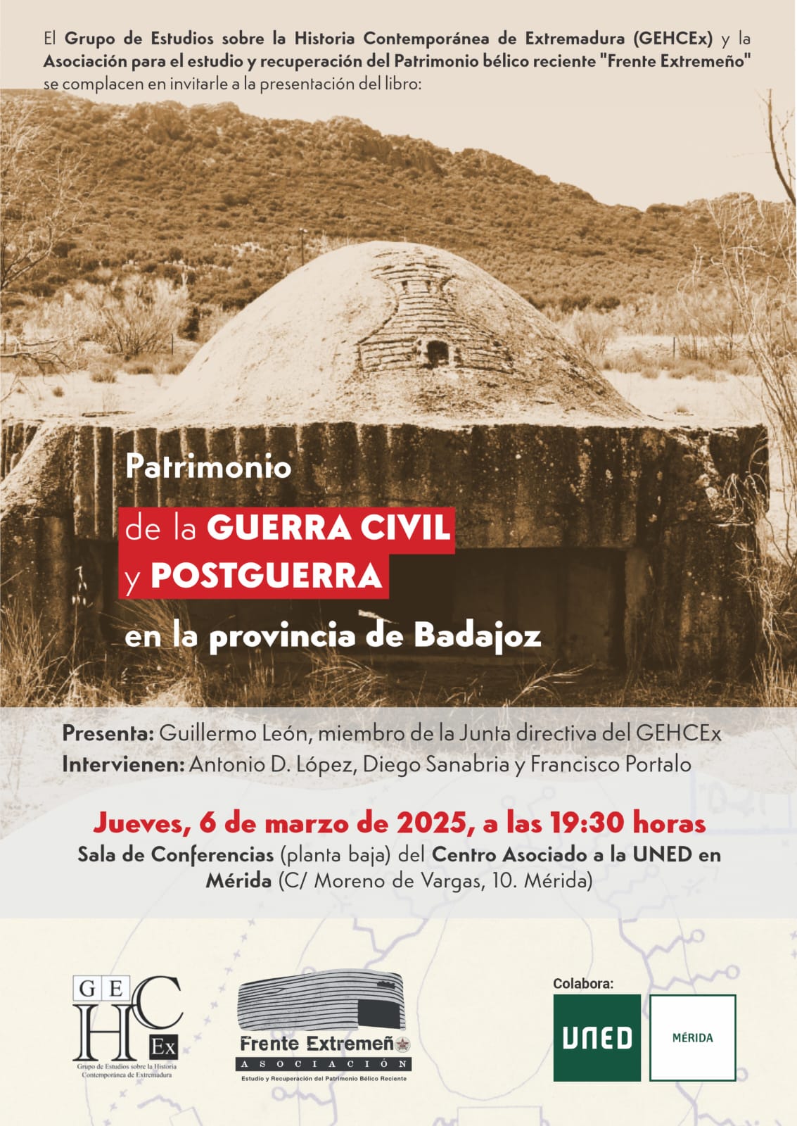 El Grupo de Estudios sobre la Historia Contemporánea de Extremadura (GEHCEx) la Asociación para el estudio y recuperación del Patrimonio bélico reciente “Frente Extremeño” ha organizado la presentación del libro de Antonio D. López, Diego Sanabria, Francisco Portalo y José Luis Rubio: