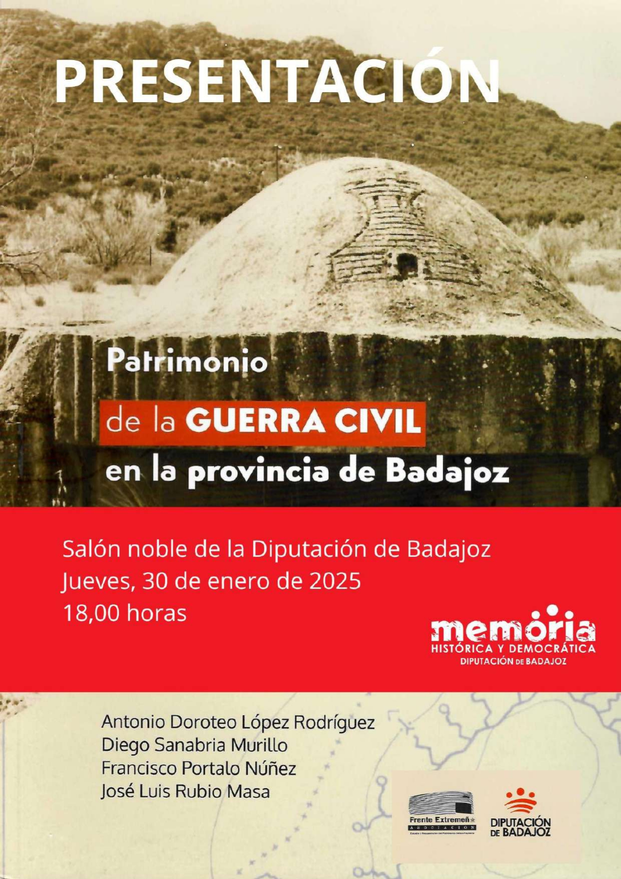 Presentación “Patrimonio de la Guerra Civil en la provincia de Badajoz” Cuándo 30 de enero de 2025 18:00 - 20:00 Añadir al calendario Descargar ICS Google Calendar iCalendar Office 365 Outlook Live Dónde Salón noble de la Diputación de Badajoz ., Badajoz Compartir: