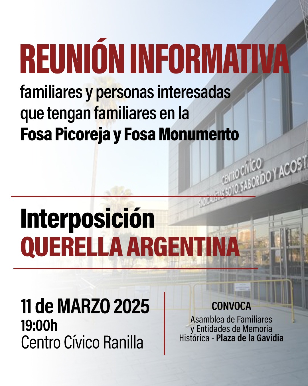 Reunión informativa. Familiares y personas interesadas que tengan familiares en la Fosa Pico Reja y Fosa Monumento Cuándo 11 de marzo de 2025 19:00 - 21:00 Añadir al calendario Descargar ICS Google Calendar iCalendar Office 365 Outlook Live Dónde Centro Cívico Ranilla , Sevilla Compartir: