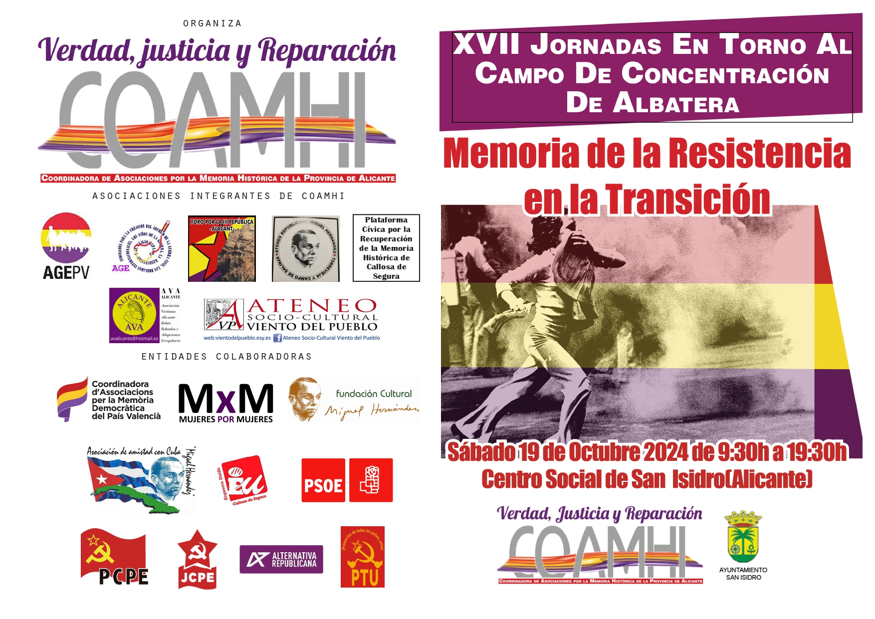 XVII Jornadas en torno al campo de concentración de Albatera Cuándo 19 de octubre de 2024 09:30 - 19:30 Añadir al calendario Descargar ICS Google Calendar iCalendar Office 365 Outlook Live Dónde Centro Social de San Isidro , Alicante Esperando vuestra asistencia y divulgación os enviamos un saludo desde COAMHI. Compartir: