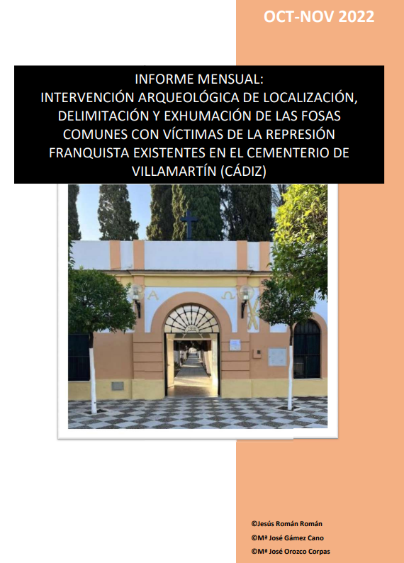 Por tanto, se presenta un balance del trabajo desarrollado durante el periodo del 16 de octubre al 30 de noviembre dentro del proyecto denominado Intervención arqueológica de localización, delimitación y exhumación de las fosas comunes con víctimas de la represión franquista existentes en el Cementerio de Villamartín (Cádiz).
