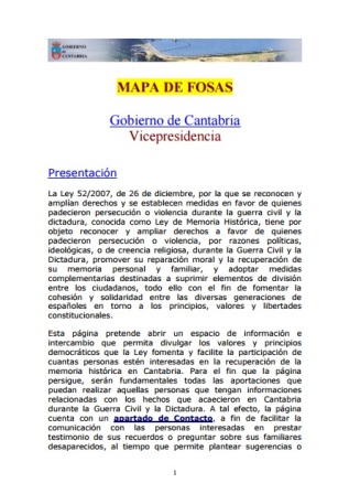El artículo añade que el Gobierno determinará el procedimiento y confeccionará un mapa integrado que comprenda todo el territorio español, que será accesible para todos los ciudadanos interesados y al que se incorporarán los datos que deberán ser remitidos por las distintas Administraciones públicas competentes. El Gobierno de Cantabria ha autorizado la celebración de un Convenio entre el Ministerio de Justicia y nuestra Comunidad Autónoma para la elaboración y aplicación del mapa integrado de fosas.