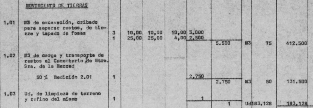En el “Proyecto de monda, demolición, adecentamiento y pavimentación del antiguo cementerio de Santo Domingo” (AMJF, Legº 5369), firmado por los arquitectos José J. Ferrari y José A. Laguillo en 1973, se habla, literalmente, de “desmonte de las fosas comunes con su correspondiente separación de huesos y traslado al nuevo cementerio; relleno de las fosas y nivelación del terreno”, de “demolición total del cementerio, incluso rebajes de tierras necesarias para igualar rasantes y transporte de escombros a vertederos autorizados”, y de “excavación, cribado para separar restos de tierra y tapado de fosas… m3 de carga y transporte de restos al cementerio de Ntra Sra. de la Merced… limpieza de terreno y refino del mismo”, todo ello por un importe de 3.224.144 pts. Y un plazo de tres meses. En el proyecto, en el apartado de movimiento de tierras, encontramos los siguientes datos: