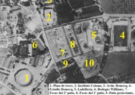 Entonces, tendríamos, según esta fotografía de sobre el año 1950 ó 1952, esta disposición de los tres patios del cementerio de Santo Domingo de Jerez: