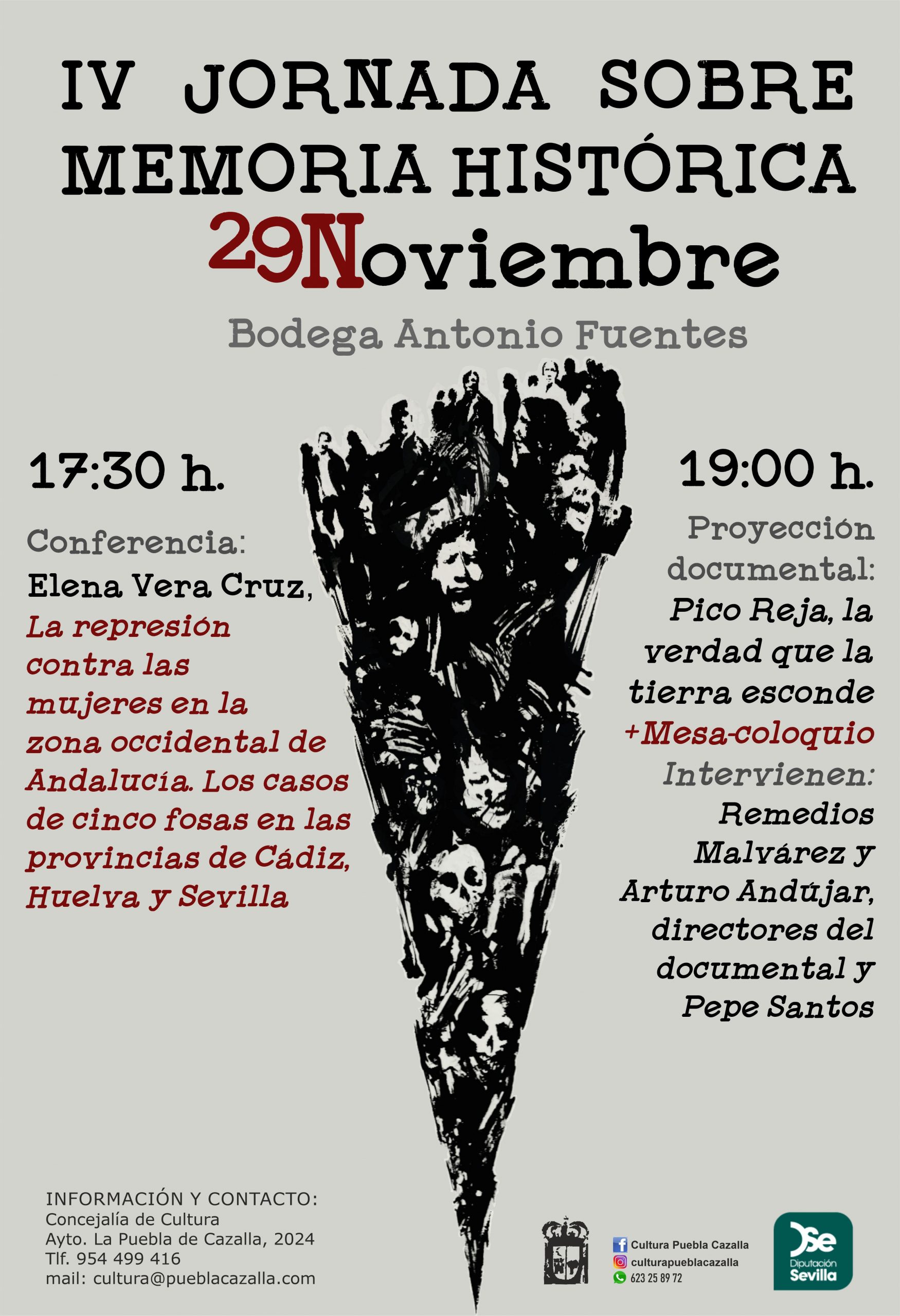 Desde la Concejalía de Cultura del Ayuntamiento de La Puebla de Cazalla le remitimos de forma adjunta, la información sobre la Jornada de Memoria Histórica que se llevará a cabo el próximo viernes 29 de noviembre en la Bodega Antonio Fuentes de La Puebla de Cazalla (Sevilla).