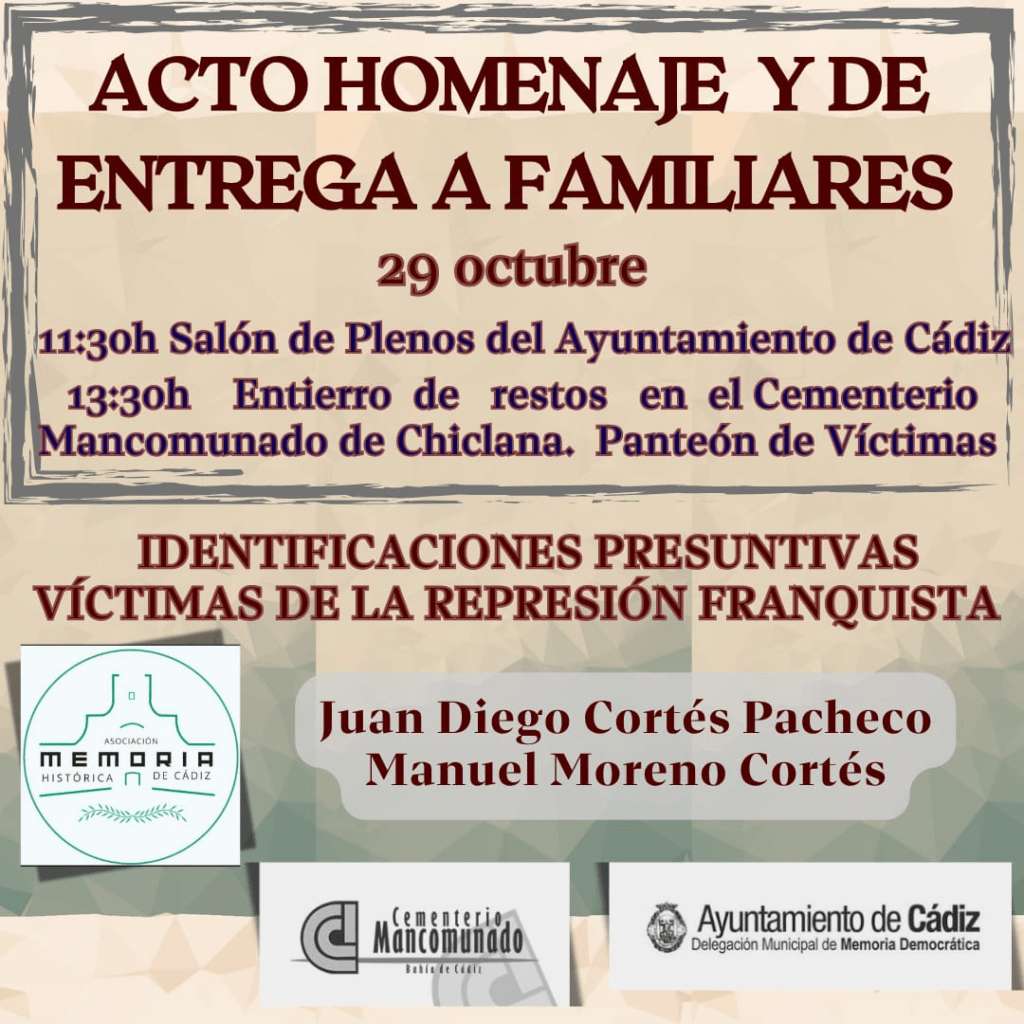 El Ayuntamiento de Cádiz acogerá la entrega a sus familias de los restos identificados de dos víctimas del golpe de Estado de 1936 Redacción 27.10.2025 El Ayuntamiento de Cádiz acogerá la entrega a sus familias de los restos identificados de dos víctimas del golpe de Estado de 1936 · Los restos de Juan Diego Cortés … Leer más