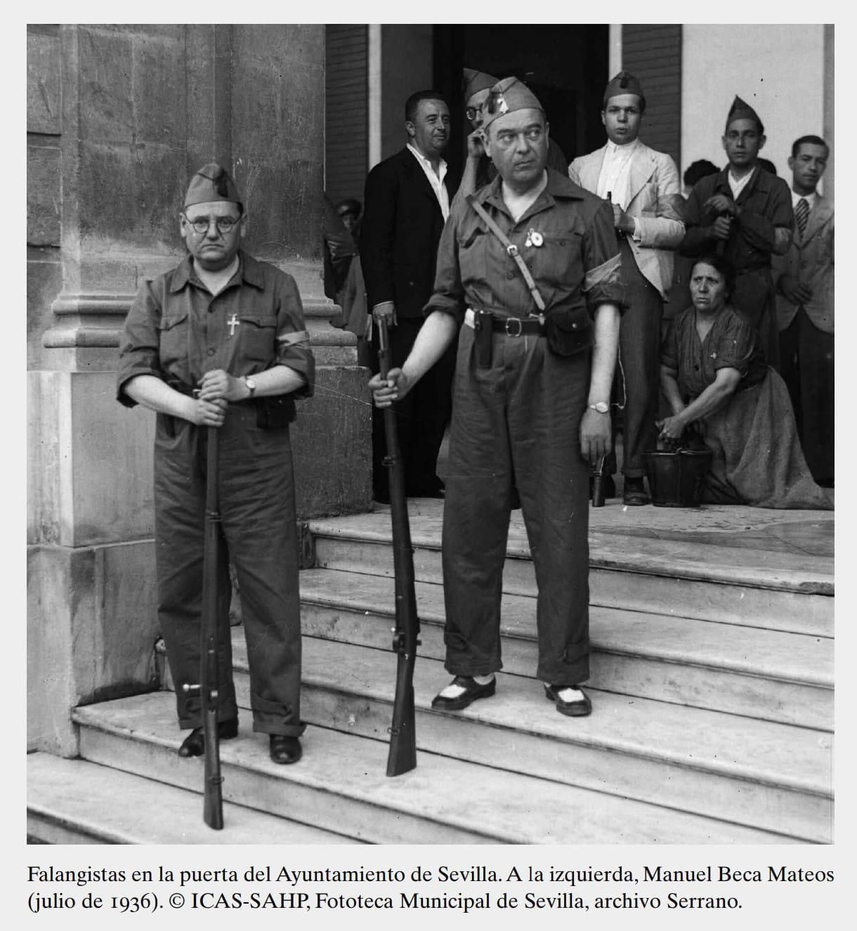 Un par de falangistas posa ante la cámara con sus fusiles en reposo y detrás hay una mujer arrodillada que sujeta un cubo entre hombres armados y sonrientes. Ese retrato (igualmente más abajo en esta información) tampoco está disponible en la exhibición de imágenes. Ni el desfile de las tropas golpistas en una plaza que preside la fachada del ayuntamiento y ahora salpica una muestra “que sirve como antesala del ambicioso proyecto de remodelación integral” que modernizará el espacio aplicándole un baño retro.